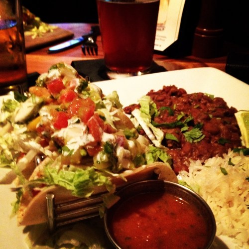 Headed up to Prime Bar last night with a buddy of mine to grab a beer, catch the baseball game and munch on some shrimp tacos. Black beans, a stiff white rice and a little lime-infused salsa. Washed it down with a Dunedin Redhead Ale.