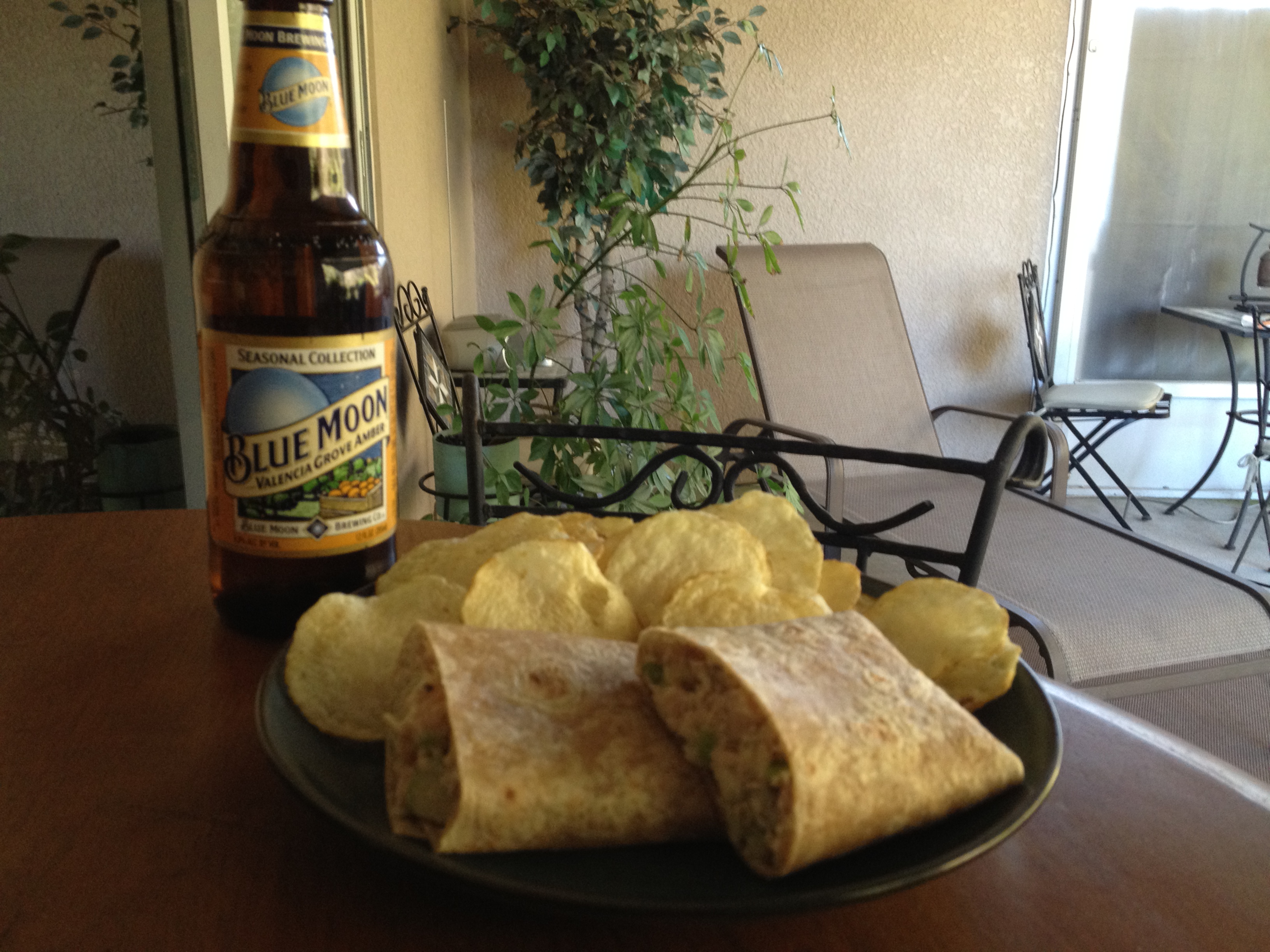 This afternoon I just loaded the chicken salad into a whole wheat wrap. Served it with some baked kettle chips and paired it with a Blue Moon Valencia Grove Orange Amber Ale whose fruit notes compliment the apples in the salad perfectly.